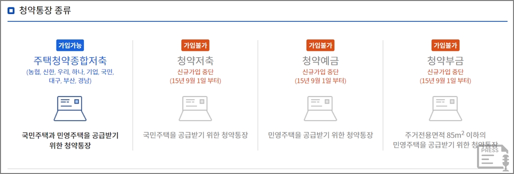 지금 가입가능한 청약통장은 주택청약종합저축입니다. 청약저축, 청약예금, 청약부금 등은 신규 가입이 중단되었습니다.