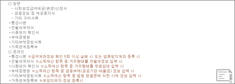 주민센터에 방문 하여 신청하는 경우에는 사회보장급여제공 신청서, 통장사본, 전월세 계약서, 가족관계등록부를 제출하면 됩니다.