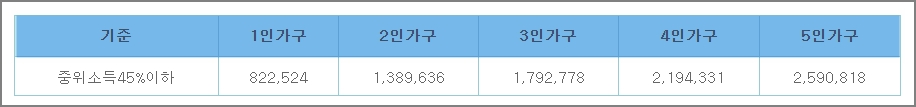 주거급여는 중위소득 45% 이하여야 합니다. 1인 가구의 경우 822,524원 이하입니다. 3인가가는 1,792,778원이하면 신청자격이 됩니다.