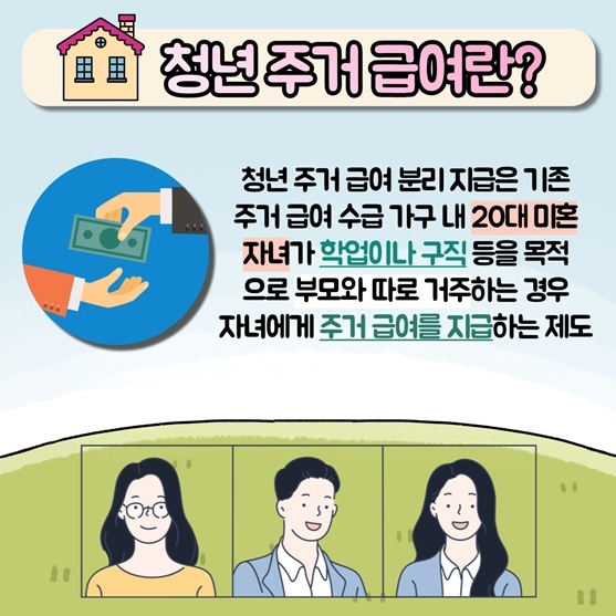 기존에는 가구주에게만 주거급여를 지급을 하였습니다. 하지만, 지금은 주거급여를 받는 가구 중에서 취학, 구직 등의 사유로 부모와 떨어져서 살고 있는 20대 미혼 청년에게도 주거급여를 지급하고 있습니다.