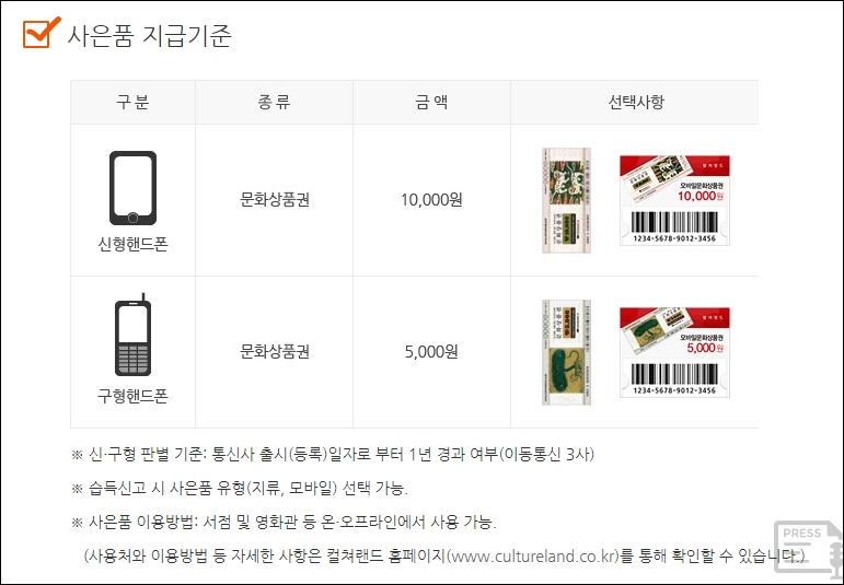 주운 핸드폰을 맡기게 사은품으로 문화상품권을 받을 수 있습니다. 신형핸드폰의 경우는 문화상품권 만원입니다. 구형핸드폰은 오천원의 문화상품권이 지급이 됩니다. 신형핸드폰은 통신사 출시일로부터 1년 이내의 핸드폰을 말합니다.