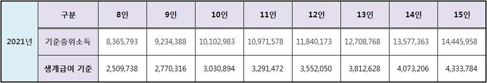 연도별 기준 중위소득을 살펴보겠습니다. 2015년 부터 2021년까지 연도별로 확인해보세요.