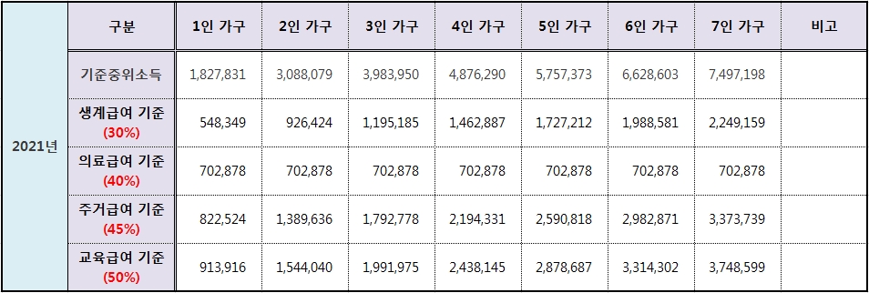 소득인정액은 기준 중위소득의 30%이하입니다. 기준 중위소득은 매년 발표를 합니다. 가구원 별로 기준 중위소득이 다릅니다. 아래 내용에서 기준 중위소득 30% 이하에 해당하는지 확인해보세요.