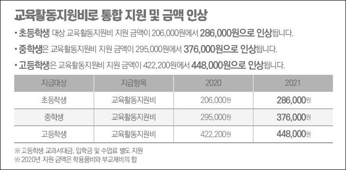 2021년 3월 부터 교육활동지원비로 통합지원이 되었습니다. 금액도 인상이 되었습니다. 초등학생은 286,000원, 중학생은 376,000원, 고등학생은 448,000원입니다. 1년에 한번 지급을 합니다.