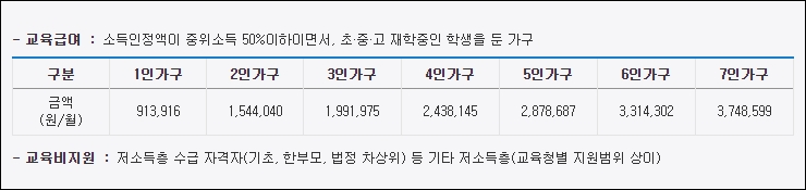 따라서, 소득인정액 기준 중위 소득 50%이하이면서, 초중고 재학중인 학생을 둔 가구는 모두 지원을 받을 수 있습니다. 다만, 의료급여특례가구 중 특례수급자로 지정되지 아니한 나머지 가구원은 교육급여를 지급하지 않습니다.