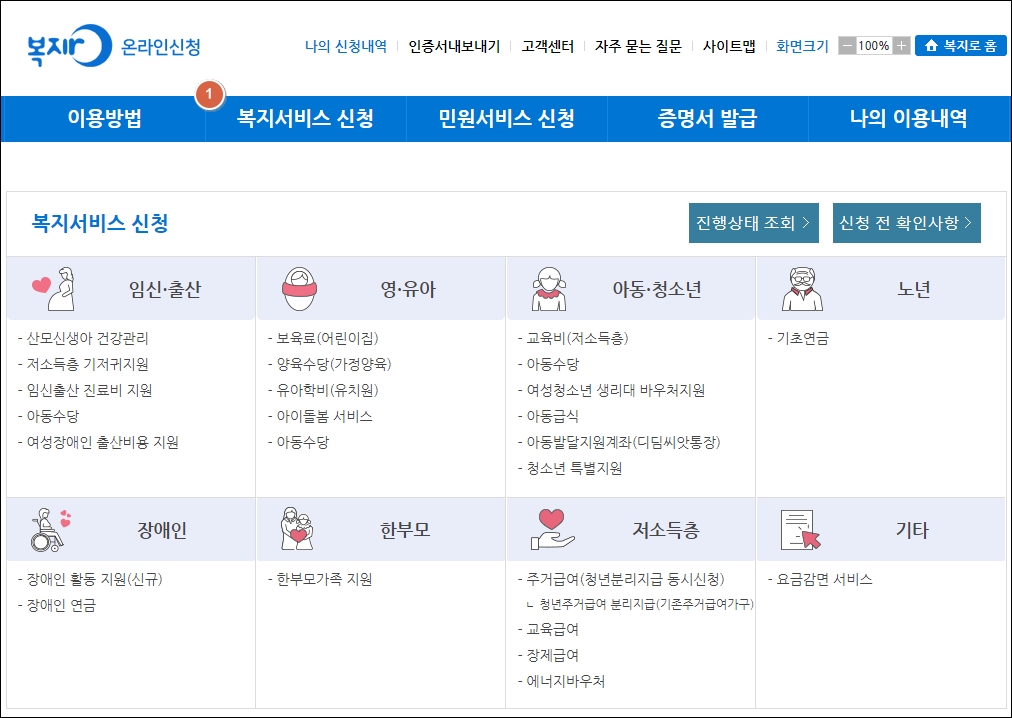 1. 상단 메뉴에서 '복지서비스 신청'을 클릭합니다.