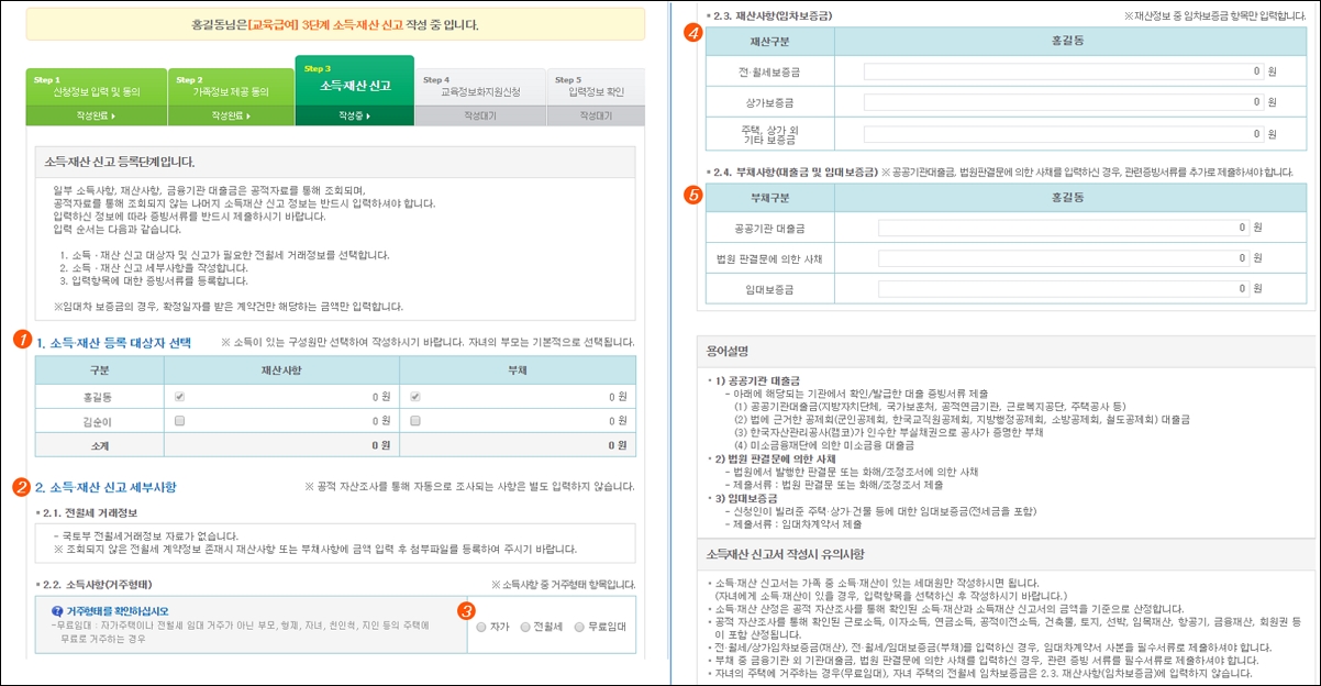 6. 소득재산을 신고합니다. 소득재산, 소득사항, 재산정보, 부채 정보 등을 입력을 합니다.