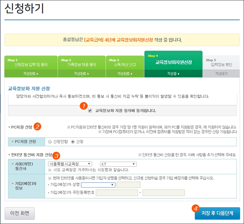 7. 교육정보화지원 동의여부 등을 선택합니다. PC 지원 신청을 선택합니다. 인터넷 회선 통신비 지원을 하기 위해 가구 주소의 시도 교육청을 선택후, 해당 지역의 신청 가능한 통신사를 선택 합니다. 가입(예정)자 정보에는 인터넷 회선을 사용중일 경우, 가입되어 있는 가구원을 선택하고 사용 예정인 경우, 가입할 가구원을 선택합니다.