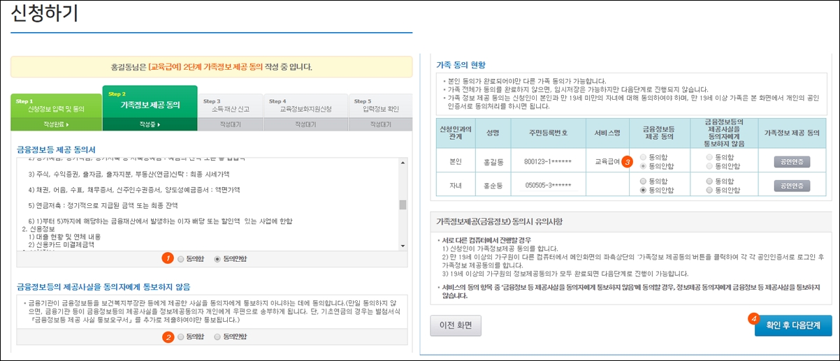 5. 가족정보 제공에 동의를 합니다. 금융정보 등 제공동의서를 읽고 동의함에 체크를 합니다. 신청인이 미성년 자녀에 대해서도 대신 동의할 수 있으며, 만 19세 이상의 가구원은 개별적으로 동의를 해야 합니다.