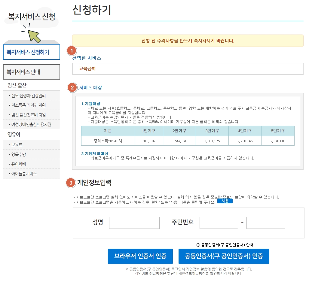 3. 신청 전 주의사항 확인 및 본인인증을 합니다. 선택한 서비스가 교육급여임을 확인합니다. 성명과 주민등록번호를 입력하고 공동인증서 인증버튼을 클릭하여 본인인증을 완료합니다.