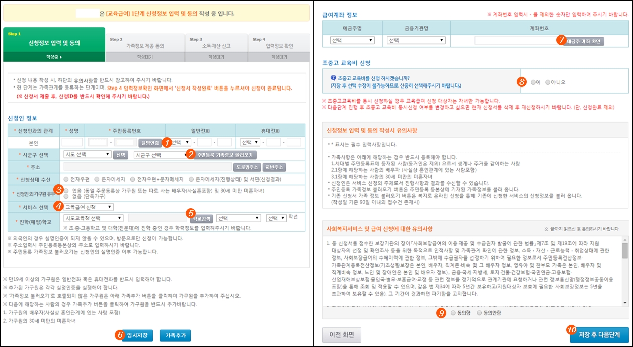 2. 복지서비스 신청하기 화면에서 '교육급여' 서비스를 선택을 합니다. 선택한 서비스에 대해 작성해야할 화면과 작성순서를 확인합니다. 저장 후 다음단계를 클릭합니다.