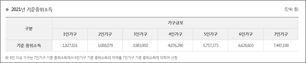 2021년 기준중위소득입니다. 1인가구는 1,827,831원입니다. 3인 가구의 경우는 3,983,950원입니다.
