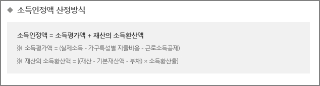 소득인정액은 집이나 자동차 등 재산을 소득으로 환산한 뒤 소득 평가액(실제 소득에서 일부 비용 등 제외)과 합산한 금액을 말합니다. 기초생활보장 수급자 선정 등 대상자 선정 시 활용이 됩니다.