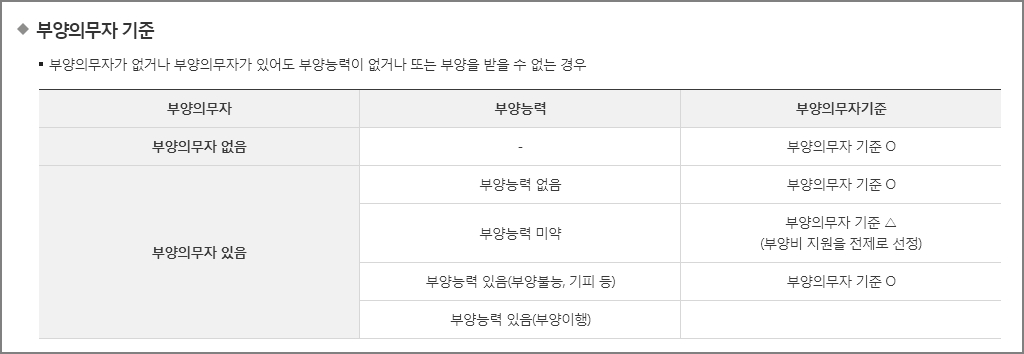 부양의무자 기준은 부양의무자가 없거나 부양의무자가 있어도 부양능력이 없거나 또는 부양을 받을 수 없는 경우여야 합니다.