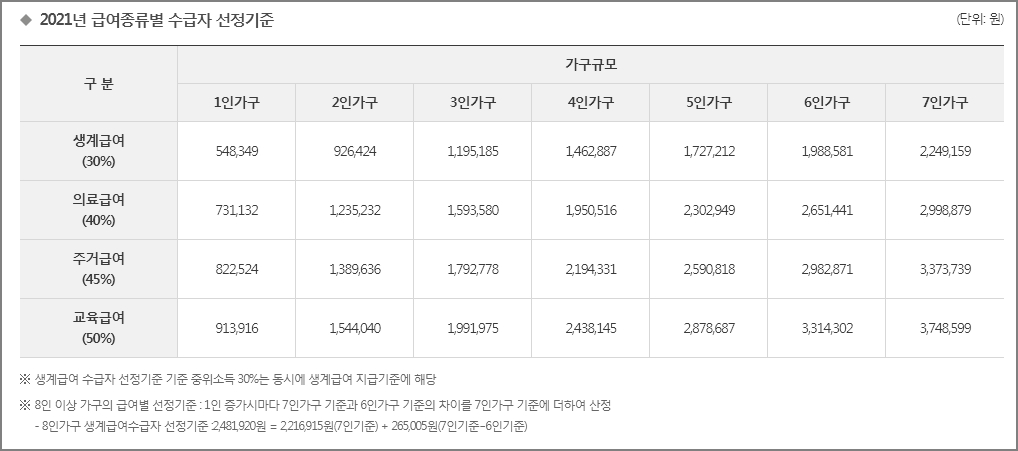 2021년 1월부터 수급(권)자 가구에 65세이상 노인, 한부모자격 책정가구(30세이상) 포함시 생계급여 부양의무자 기준을 완화하여 적용합니다.