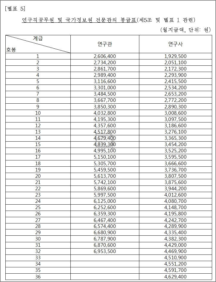 2022년 연구직 공무원 봉급표입니다. 연구직공무원 및 국가정보원 전문관의 2022년 봉급표입니다. 연구관과 연구사로 계급이 구분이 됩니다. 1호봉부터 36호봉까지 있습니다. 연구사 1호봉은 1,929,500원입니다. 연구관 1호봉의 봉급표는 2,606,400원입니다.