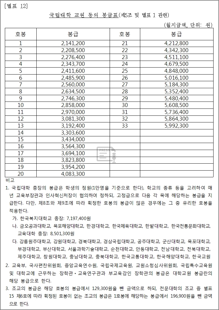 2022년 국립대학 교원 등의 봉급표입니다. 1호봉부터 33호봉까지 있습니다. 2022년 국립대학 교원 1호봉의 봉급표는 2,141,200원입니다. 조교 등의 봉급표는 아래 비고 내용에서 확인해보시기 바랍니다.
