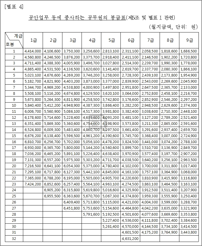 다음은 공안업무 종사 공무원의 2022년 봉급표입니다. 공안업무에 종사하는 공무원은 9급부터 1급까지 있습니다. 일반직공무원의 봉급표와 동일해보이지만, 자세히 보면 차이가 있습니다. 일반직 공무원 보다 조금 봉급이 많습니다.