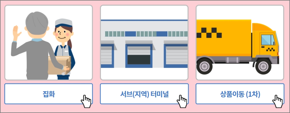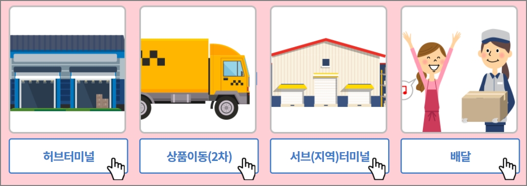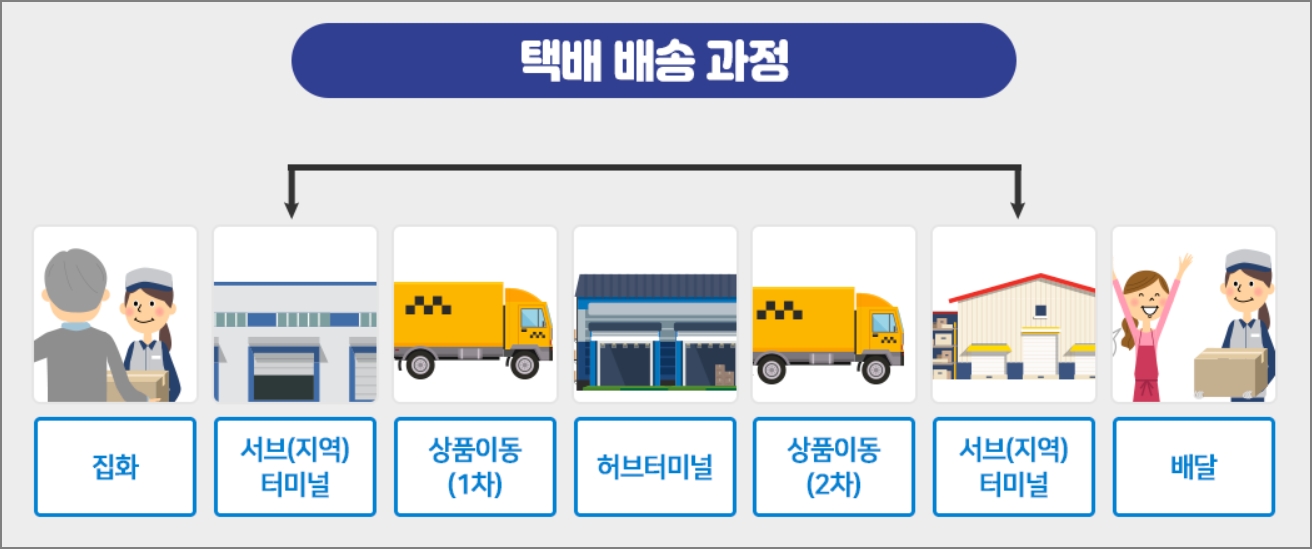 택배 배송과정은 집화-터미털-상품이동-허브-상품이동-터미널-배달 등 7단계의 과정을 거쳐 배송이 됩니다.