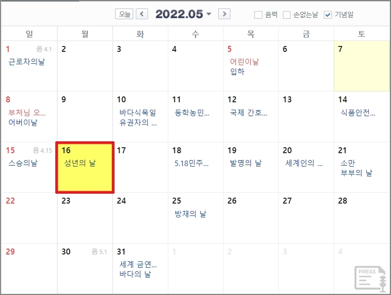 2022년 성년의 날은 5월 16일입니다.