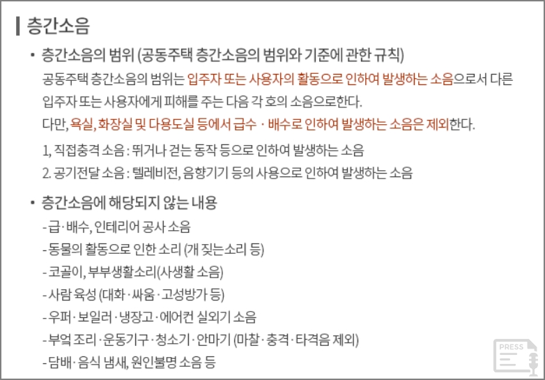 아파트 등 공동주택에서 층간소음의 범위부터 확인이 필요합니다. 층간소음에는 직접충격에 의한 소음과 공기전달로 인한 소음이 있습니다. 띄거나 걷는 동작 등으로 인해 발생하는 소음은 직접충격 소음입니다. 텔레비전, 음향기기 등의 사용으로 인해 발생하는 소음은 공기전달 소음입니다.