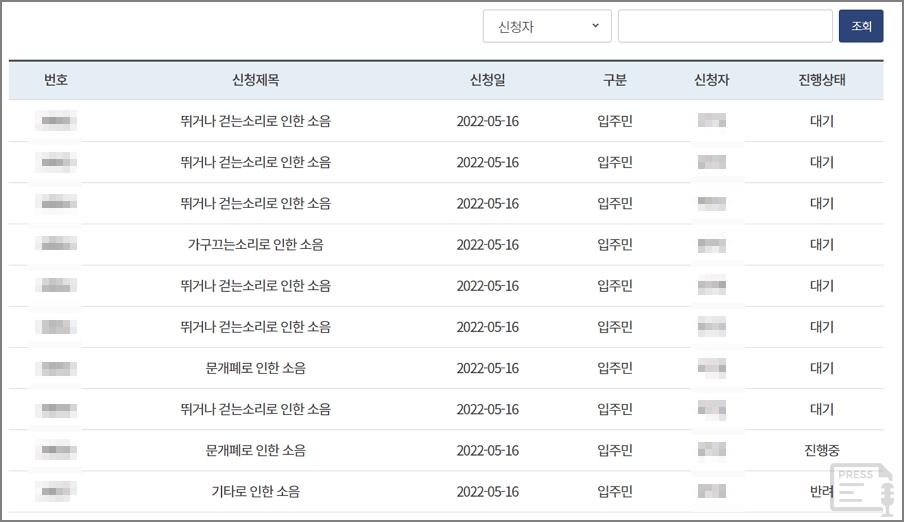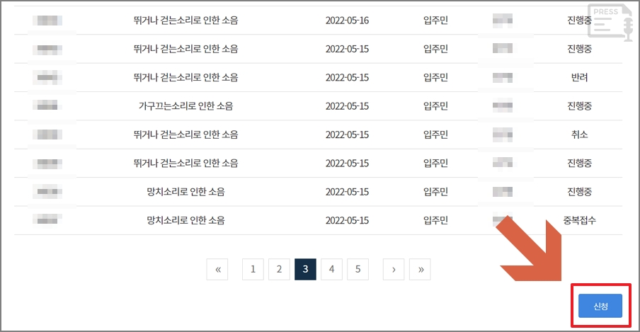 게시판을 보면 하루에도 수십건의 층간소음 상담신청이 이루어 지고 있습니다. 상담신청 하단의 "신청" 버튼을 클릭 후 본인인증 후 신청내용을 입력하면 됩니다.