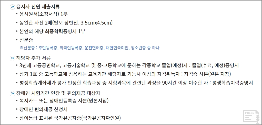 응시원서, 사진 2장, 신분증 사본 등이 필요합니다.