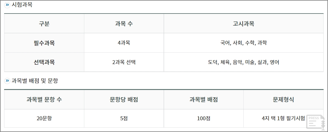 시험과목은 총 6과목입니다. 필수 4개(국어, 사회, 수학, 과학), 선택 2개(도덕, 체육, 음악, 미술, 실과, 영어) 입니다. 과목별 20문항이며, 배점은 5점입니다. 보기 4개 중에서 정답 1개를 선택하면 됩니다. 시험은 40분에 2과목씩 3교시 시험을 봅니다.