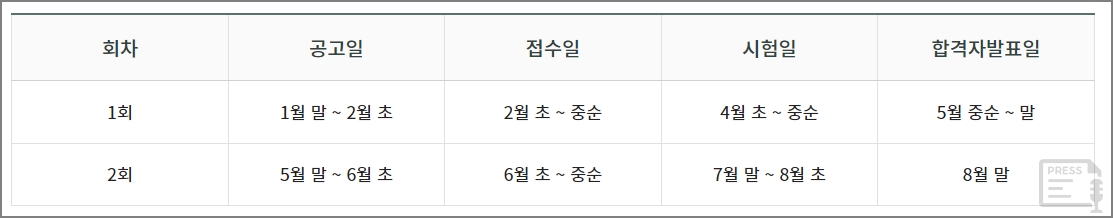- 1회차는 1월~2월 사이에 공고 및 접수를 합니다. 시험은 4월, 합격자 발표일은 5월 정도입니다.