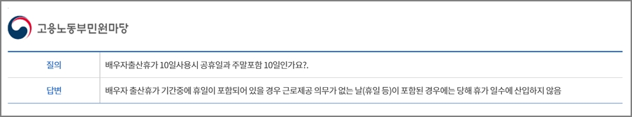 배우자 출산휴가 기간은 10일이며, 유급입니다. 출산휴가 기간 중 휴일이 있는 경우 출산휴가 일수에 포함하지 않습니다. 즉, 휴일 등을 제외하고 10일입니다. 배우자가 10일 미만으로 청구를 하여도 회사는 10일 부여해야 합니다.