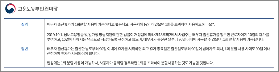 배우자 출산휴가는 분할사용도 가능합니다. 회사 일 등 어쩔 수 없는 경우 분할해서 사용을 해도 됩니다. 1회에 한해 분할 사용이 가능합니다. 분할 사용에 대한 일수제한은 없습니다. 다만, 2회 신청의 경우 출산일로부터 90일 이내 신청해야 합니다.