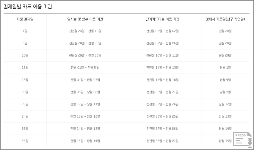 지정결제일 26일 (일시불 및 할부이용기간) 전월 15일 ~ 당월 14일 , (현금서비스 이용기간) 전전월 28일 ~ 전월 27일