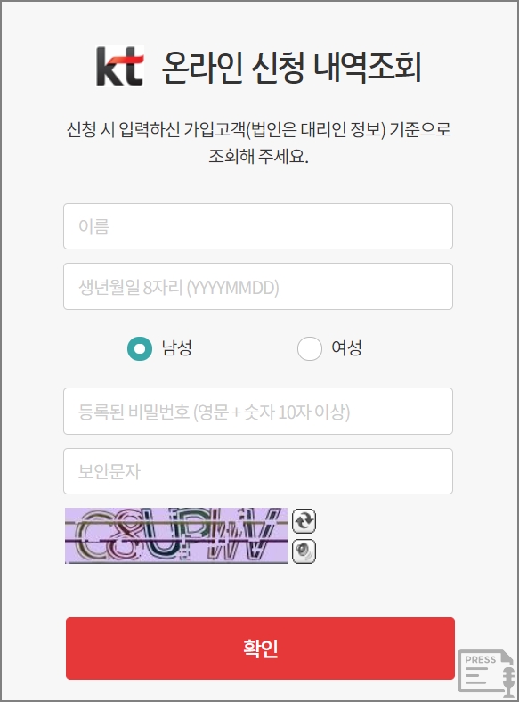 KT 온라인 신청 내역조회 입니다. 최근에 바뀌었습니다. 신청 시 입력하신 가입고객(법인은 대리인 정보) 기준으로 조회를 해주세요. <▼KT 개통 조회 바로가기>