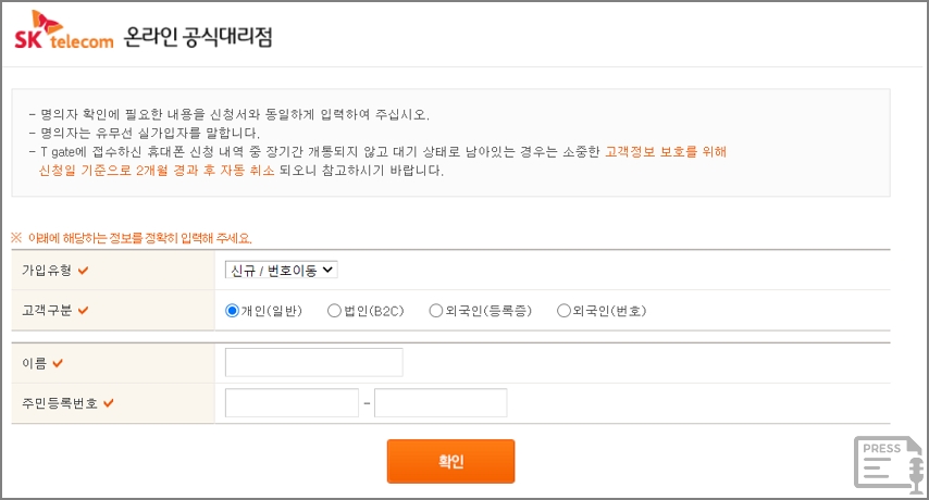 가입유형(신규/번호이동, 기기변경), 고객구분(개인, 법인, 외국인), 이름과 주민등록번호를 입력 후 확인버튼을 클리하세요.