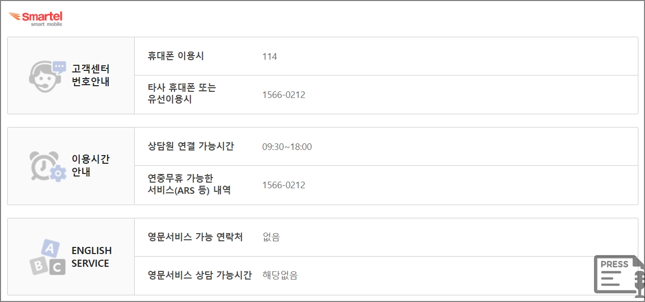 스마텔 고객센터 입니다. 휴대폰 이용시에는 114번을 누르면 됩니다. 타사 휴대폰 또는 유선을 이용시에는 ☎1566-0212 입니다. 상담원 연결 가능시간은 09:30~18:00입니다.