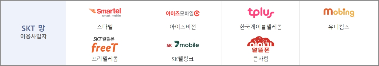 SKT망을 사용하는 알뜰폰입니다. 스마텔, 아이즈비전, 한국케이블텔레콤, 유니컴즈, 프리텔레콤, SK텔링크, 큰사람 등이 있습니다.