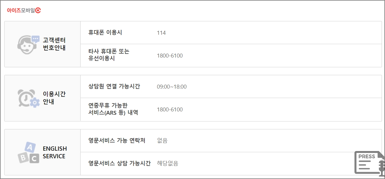 아이즈모바일, 아이즈비전 고객센터 입니다. 휴대폰 이용시에는 114, 타사 휴대폰 또는 유선이용시에는 ☎1800-6100입니다. 상담시간은 09:00~18:00까지 입니다.