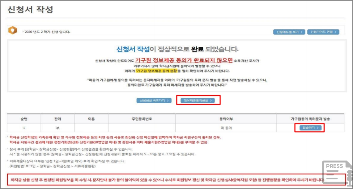 또한, 본인의 정확한 학적을 입력하여야 하며, 형제, 자매 및 자녀 정보 등을 정확히 입력하여야 합니다. 그리고 꼭 가구원 동의 및 서류를 제출하여야 합니다. 가구원 미동의 또는 서류 제출대상자가 서류를 제출하지 않는 경우 지급이 되지 않습니다.