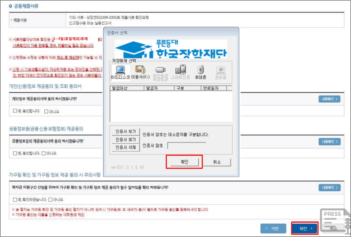 국가장학금 신청자는 학자금 지원구간 심사 서류를 제출하고, 가구원 정보 제공 동의를 완료해야 합니다. 학자금 지원 구간 산정을 위해 학생 본인과 가구원의 소득, 재산, 부채를 함께 조회를 하여야 함으로 가구원에 대한 정보 제공 동의를 꼭 하여야 합니다. 다만, 가구원이 해외체류, 고령 등의 사유로 공인인증서 활용이 어려우면, 동의서를 우편이나 팩스로 제출하거나 신분증을 가지고 각 지역의 현장지원센터에 방문하여 신청하면 됩니다.