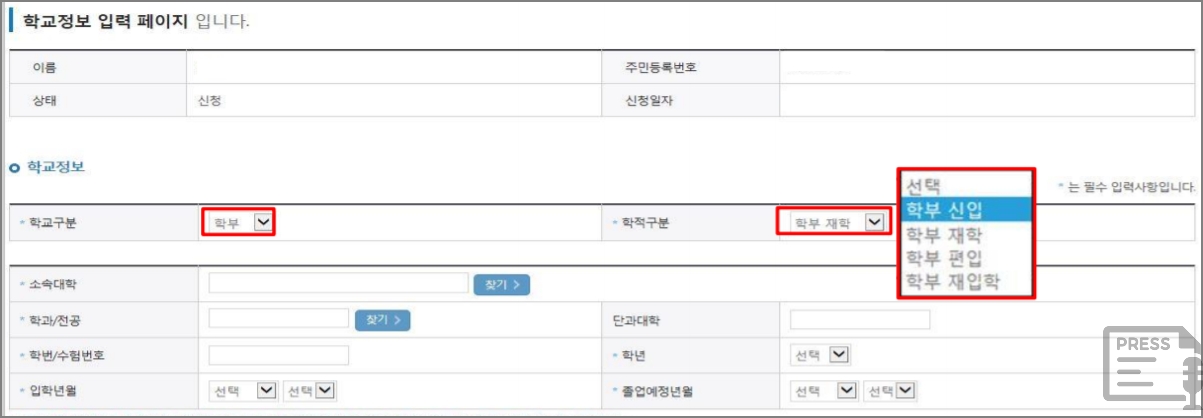 ▼ (4단계) 학교정보 및 학적정보를 입력합니다.