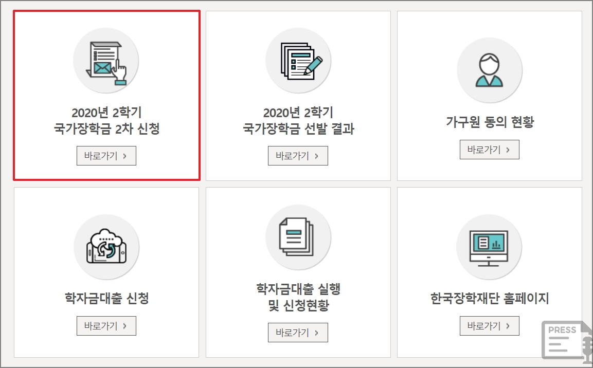 국가장학금 신청은 1년에 2번합니다. 보통 5월에 1번, 8월에 1번 합니다. 5월에 1차 신청, 8월에 2차 신청을 합니다. 현재 학국장학재단 홈페이지에서 8월 20일부터 9월 15일 오후 6시까지 2020년도 국가장학금 2학기 2차 신청 접수를 받고 있습니다. <한국장학재단 바로가기>