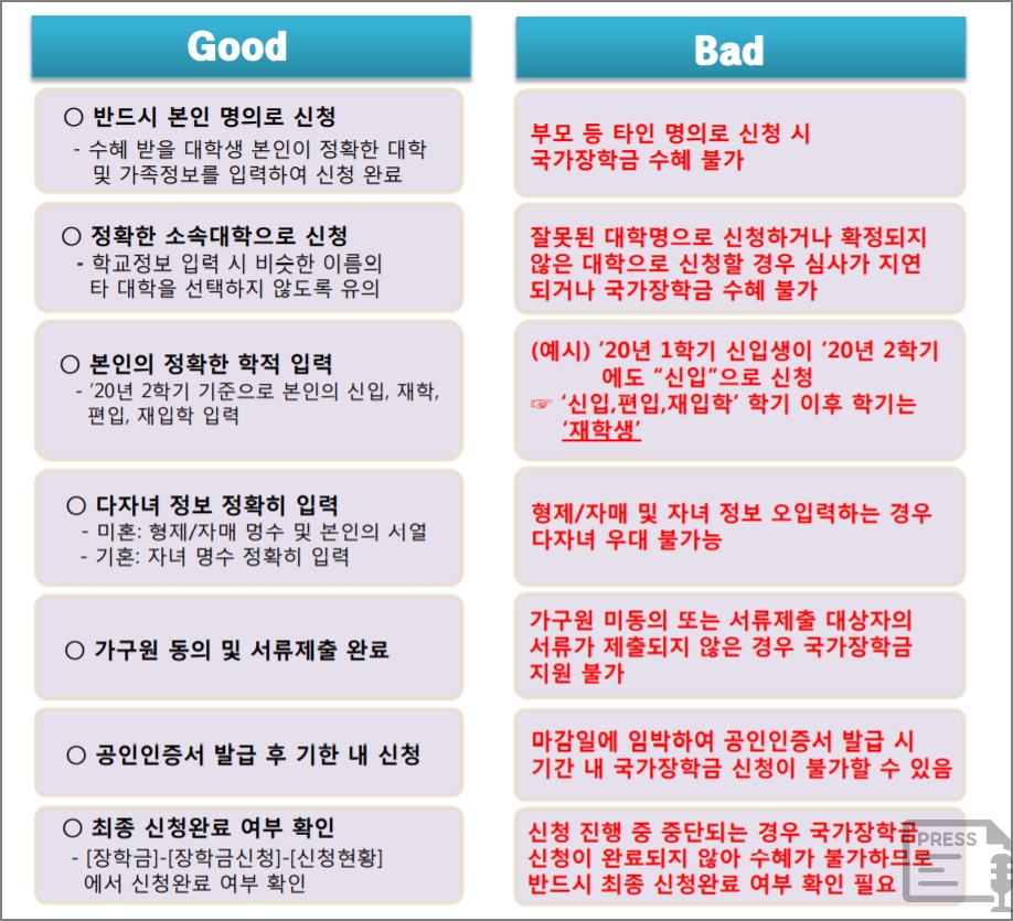 국가장학금을 신청할 때에는 꼭 지켜야 하는 사항이 있습니다. 반드시 본인 명의로 신청을 하여야 합니다. 부모 등 타인 명의로 신청 시 지원을 받을 수 없습니다. 그리고 정확한 소속 대학으로 신청을 하여야 합니다. 잘못된 대학명으로 신청하가너 확정되지 않은 대학으로 신청하는 경우 심사가 지연되거나 국가장학금이 불가합니다.