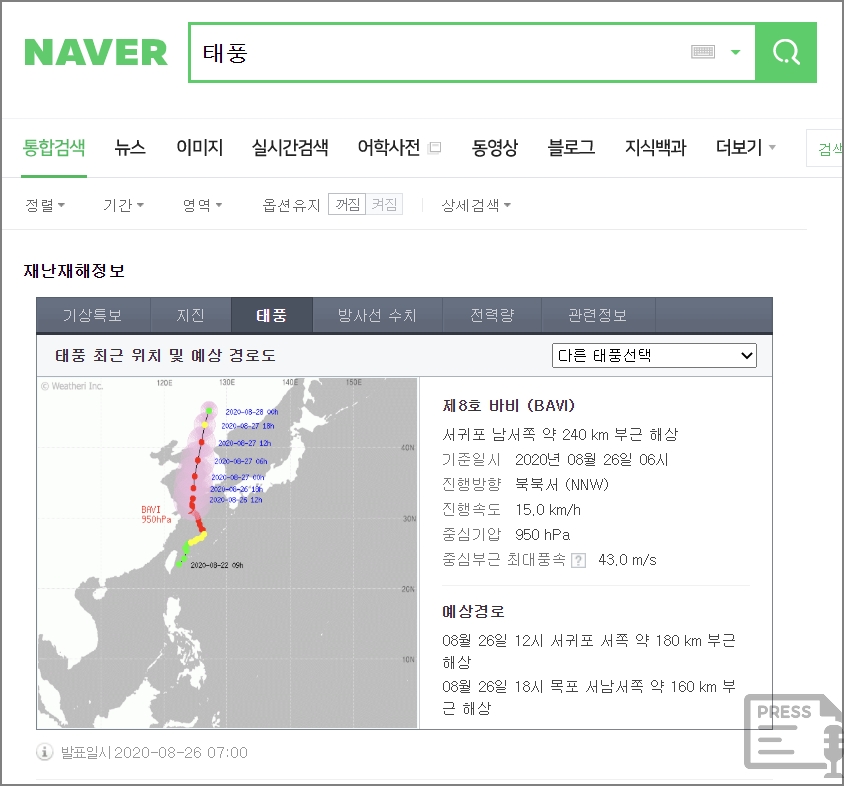 태풍의 위치를 확인하는 가장 쉬운 방법은 네이버, 다음 등 포털사이트에서 "태풍"으로 검색하면 됩니다. 요새는 포털 등에서 바로 태풍 최근 위치 및 예상경로도를 제공하고 있습니다. 아래와 같이 이미지로 태풍의 이동경로를 확인할 수 있습니다. <▼태풍 위치 확인하기>