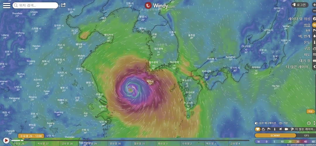 태풍 이동경로를 다이나믹하게 볼수 있는 사이트들이 있습니다. 윈디닷컴, 어스널스쿨넷 등입니다. 이 사이트에서는 태풍 경로를 실시간 등으로 확인이 가능합니다.