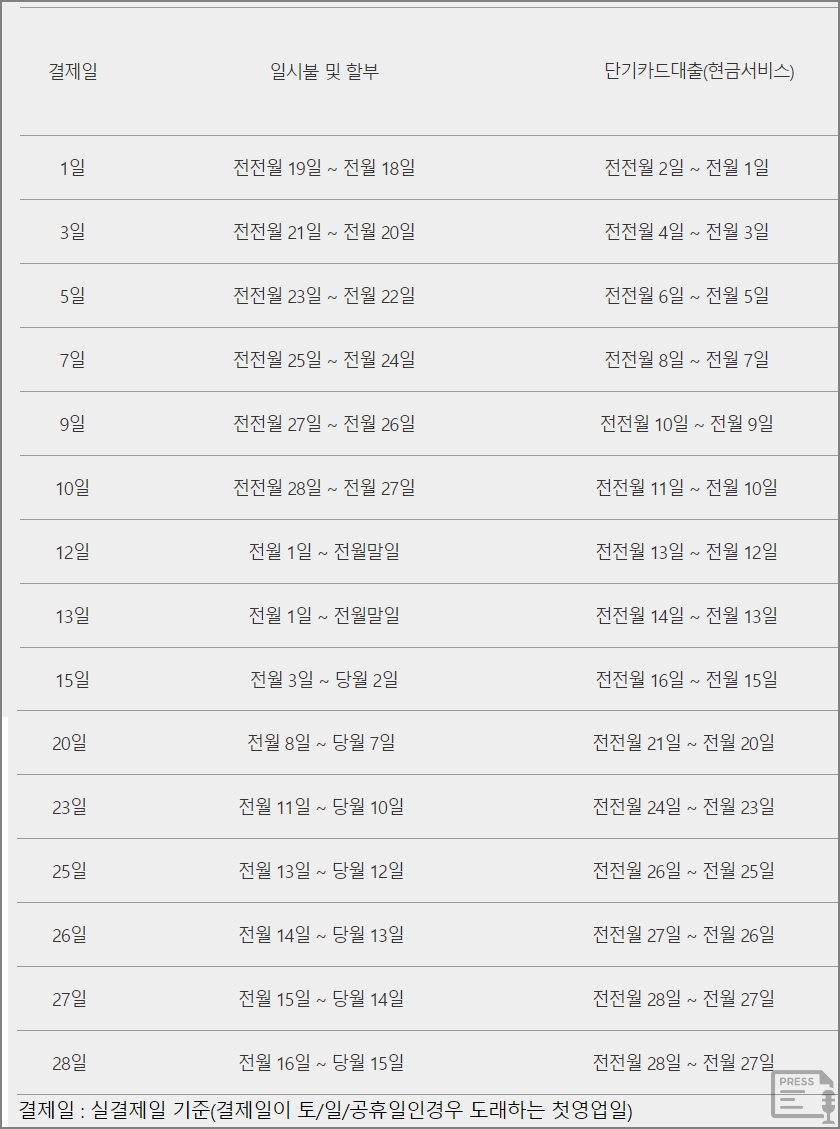 이 경우 결제일은 5일, 12일, 23일, 27일 입니다. 며칠 없어서 선택의 폭이 매우 적습니다. 거기다가 카드사용기간도 씨티카드와는 다릅니다. 결제일이 27일인 경우 전월 15일부터 당월 14일까지 사용한 금액이 적용이 됩니다.