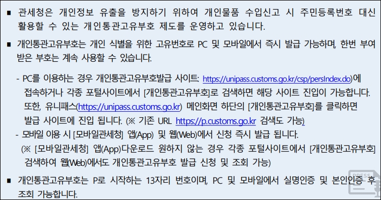 따라서, 해외에서 구입한 물건의 통관을 위해서는 관세청 전자통관 사이트에서 주민등록번호를 대신할 개인통관 고유부호를 발급받아야 합니다. 참고로 고유번호가 아니라 고유부호입니다.