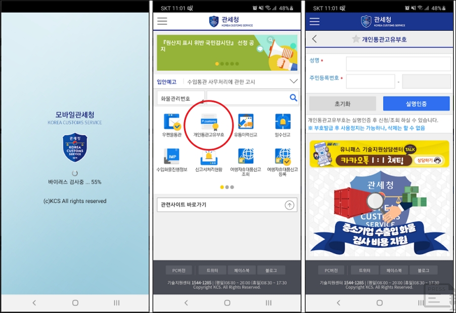 세관에서 직접 방문하여 신청도 가능합니다. 신청서, 주민등록증(신분증) 사본이 반드시 있어야 합니다. 본부세관 부호관리자가 수작업으로 등록을 하기 때문에 권장하지 않습니다. 본인명의 휴대폰이 없다거나 하는 특별한 사유가 없다면 24시가간 신청이 가능한 PC와 모바일로 신청을 하시기 바랍니다. 발급이 완료가 되면 SMS문자로 통보를 해줍니다.