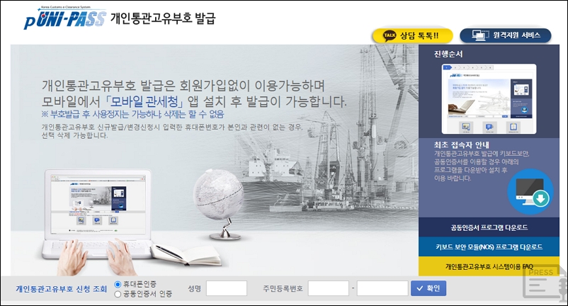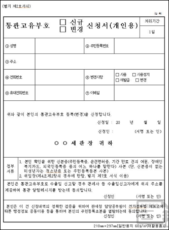 세관에서 직접 방문하여 신청도 가능합니다. 신청서, 주민등록증(신분증) 사본이 반드시 있어야 합니다. 본부세관 부호관리자가 수작업으로 등록을 하기 때문에 권장하지 않습니다. 본인명의 휴대폰이 없다거나 하는 특별한 사유가 없다면 24시가간 신청이 가능한 PC와 모바일로 신청을 하시기 바랍니다. 발급이 완료가 되면 SMS문자로 통보를 해줍니다.