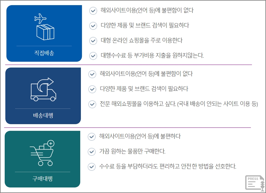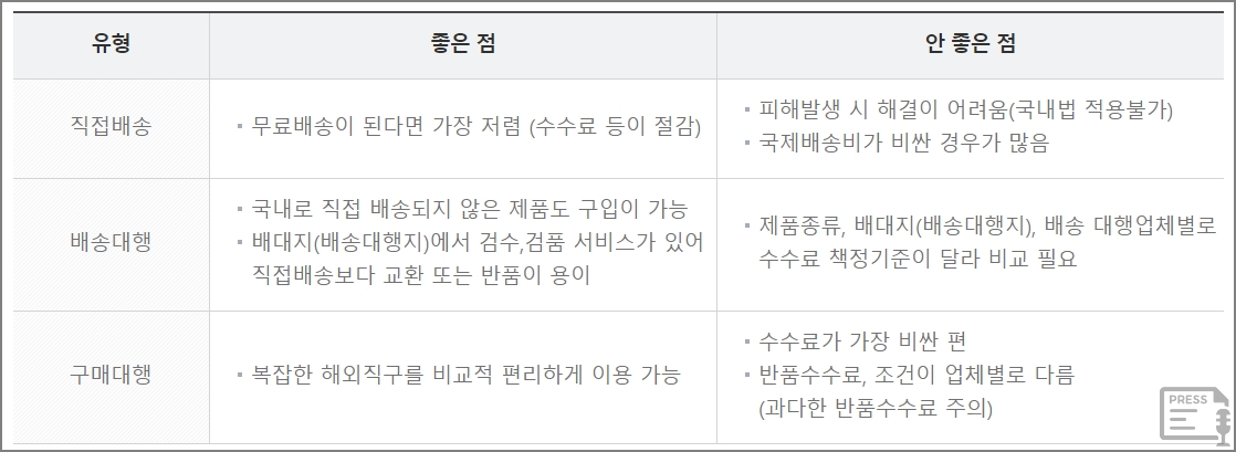 해외 직구 유형은 구매거래 형태에 따라 크게 3가지로 구분이 됩니다. 바로 직접배송, 배송대행, 구매대행입니다. - 해외직구 초보 가이드, 해외직구를 하는 이유