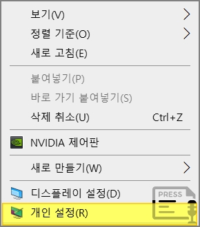 이제 설정방법입니다. 바탕화면에서 오른쪽 마우스 우클릭을 하면 메뉴가 나타납니다. 여기에서 개인 설정(R)을 클릭하면 됩니다.
